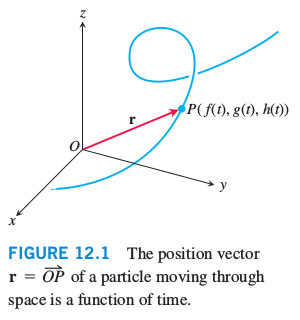 \begin{equation} x = f(t), \ y = g(t),\ z = h(t) \ \ \ \mbox{for}\ \ t\in I = [a, b]. \end{equation}The points $(x, y, z) = (f(t), g(t), h(t))$ make up the curve in space that we call a particle's path.